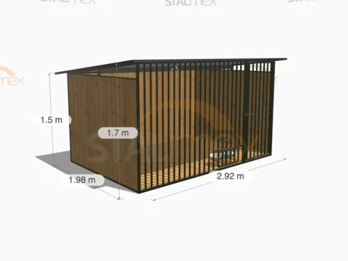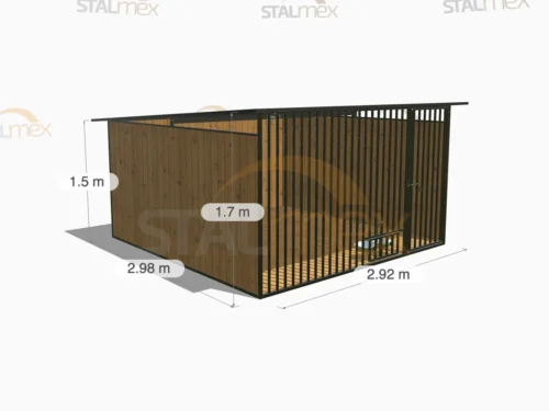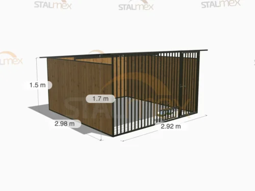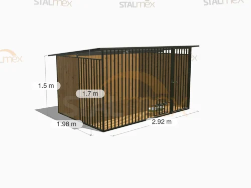 Kojec o wymiarach zewnętrznych 2,92 × 1,98 m przeznaczony do wydzielenia stabilnej przestrzeni dla psa. Konstrukcja oparta na stalowych profilach 20×20 mm, ustawionych pionowo, tworzy gładką powierzchnię ścian i utrudnia psu wspinanie. Model wyposażono w drewnianą podłogę oraz dach jednospadowy ze spadem do tyłu, co ułatwia odprowadzenie opadów i zwiększa funkcjonalność użytkową.