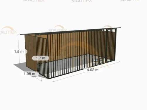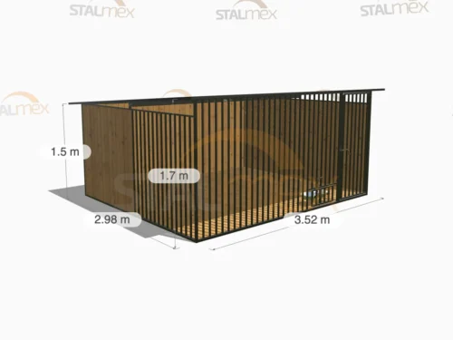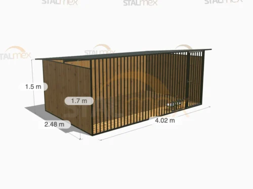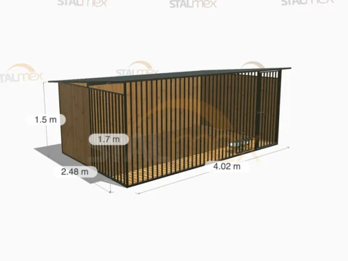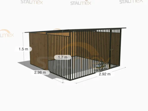 Solidny kojec dla psa, którego konstrukcja (profile 20×20) jest w całości spawana i zabezpieczona czarną farbą nawierzchniową. Wyróżnia się rozbudowaną, asymetryczną zabudową drewnianą (dwie pełne ściany i osłona boczna). Dostępny w wielu wariantach rozmiarowych.
