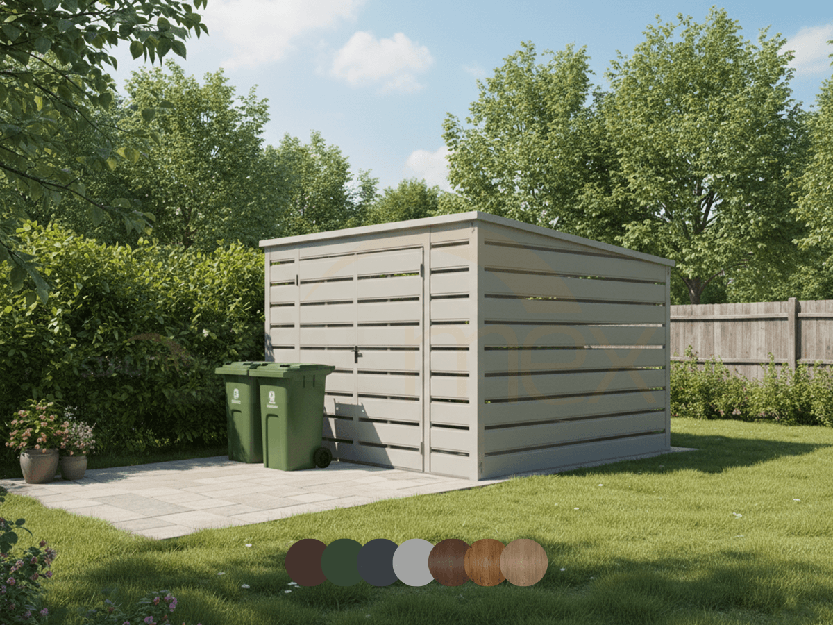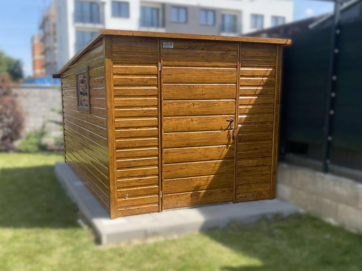 Domek ogrodowy 5×3 m Złoty Dąb / Grafit | Boczna Wiata 1m | Okno | Profil